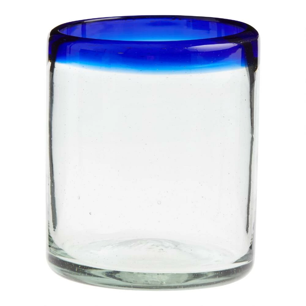 Our festive double old-fashioned glass is handcrafted of thick glass with a brilliant blue rim, a traditional design touch from Mexico. Perfect for outdoor entertaining or spicing up your next indoor fiesta, this high-quality bar glass has a comfortable weighty feel and distinctively artisan look.