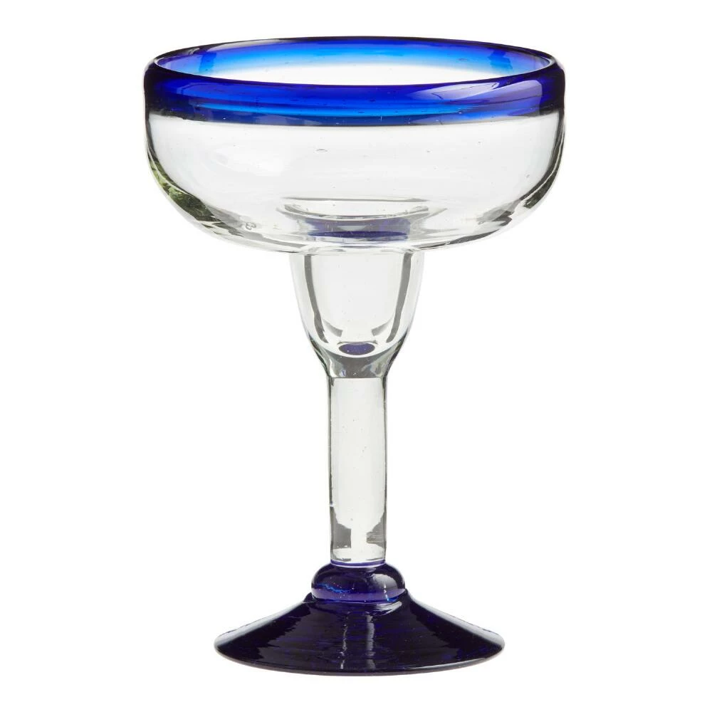 Our festive margarita glass is handcrafted of thick glass with a brilliant blue rim, a traditional design touch from Mexico. Perfect for outdoor entertaining or spicing up your next indoor fiesta, this high-quality bar glass has a comfortable weighty feel and distinctively artisan look.