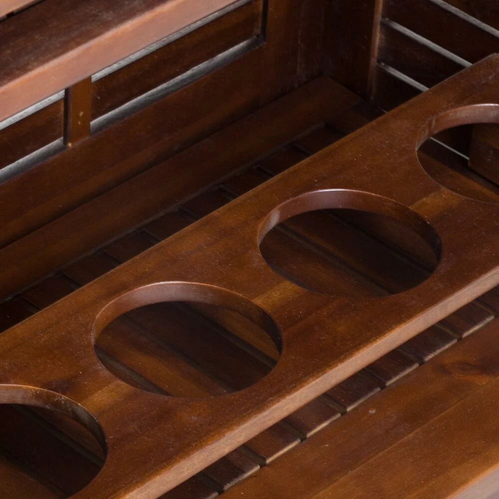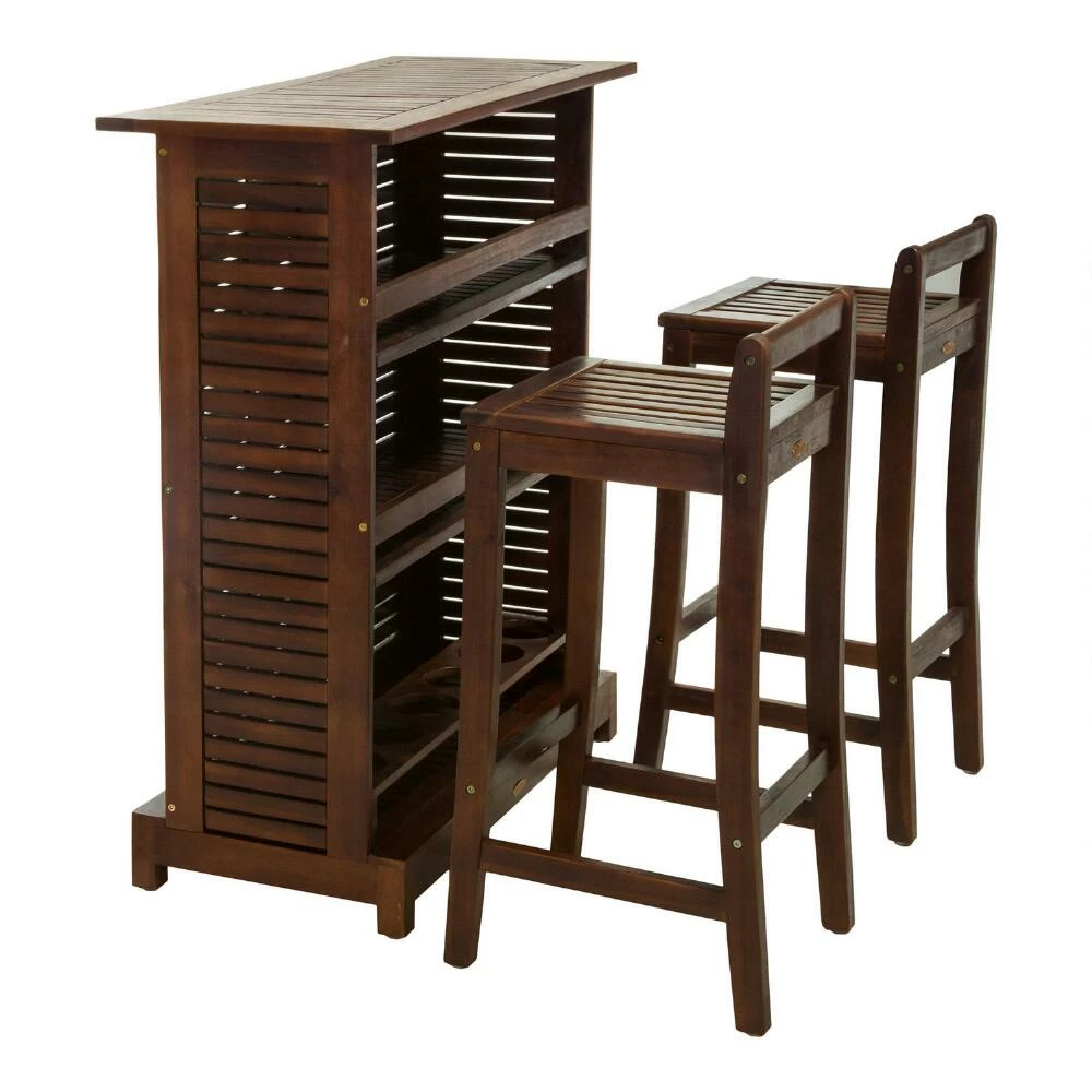 Made of all-weather acacia wood with a rich mahogany finish, the Romina bar furniture set readies your backyard or poolside lounge for pub-style entertaining. Both attractive and durable, the slat-panel outdoor bar is designed for easy serving with 3 shelves to keep glassware and bottles at the ready. Guests can perch on the two comfortable low-back barstools to chat, dine and toast the host with delicious drinks.