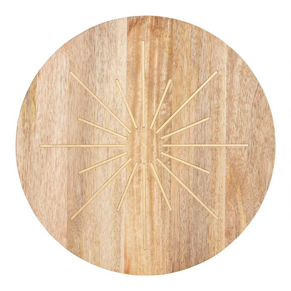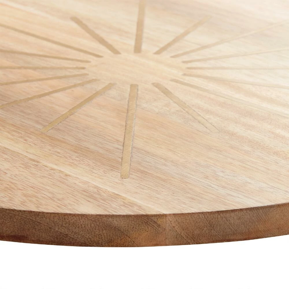 The golden rays of a sunrise-inspired metal inlay add glamorous geometric flair to our round acacia wood serving board. With its natural woodgrain patterns and bright gold design, it creates a striking presentation of cheeses, charcuterie and small bites for indoor or outdoor entertaining, and it makes a memorable artisan gift.