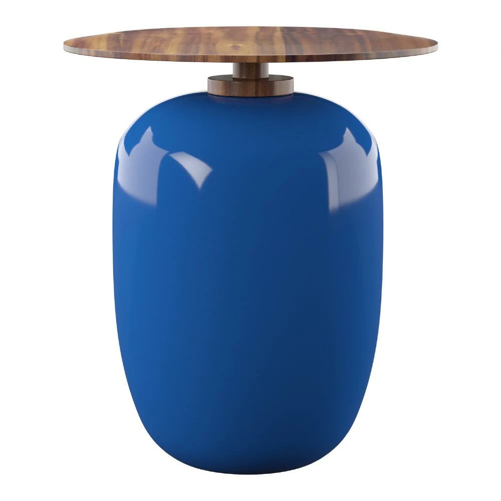 This patio side table ornaments your outdoor seating arrangement with a shapely ceramic base in bright blue and a round all-weather acacia wood surface. A durable outdoor end table for small patios and decks, its striking architectural design and two-tone look works just as well indoors.