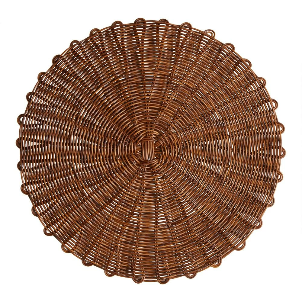 Crafted in the style of rattan in a natural brown tone, this wipe-off round placemat brings a look of warm texture to your indoor or outdoor dining table. Use it as a table protector for serveware or buy multiples and use them to layer with more traditional linens for a put-together look. Generously sized and easy to clean, our exclusive mat makes a practical additional to your table linen collection.