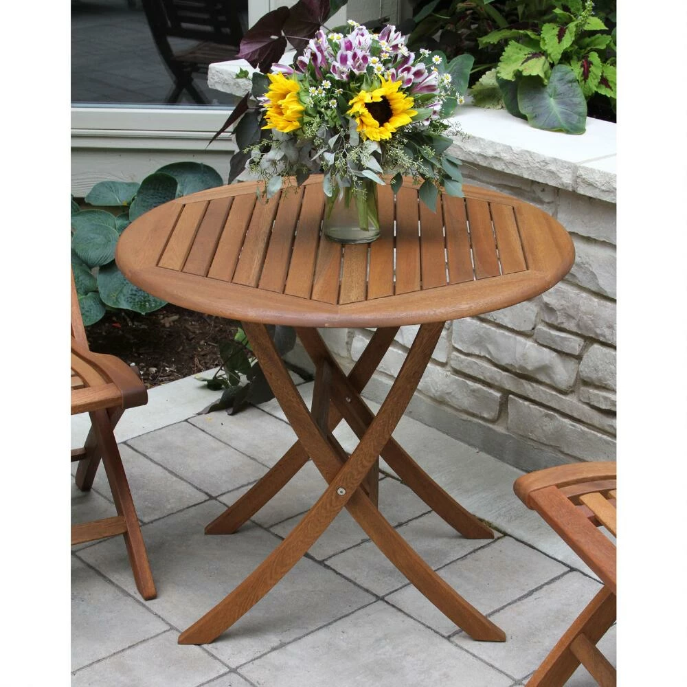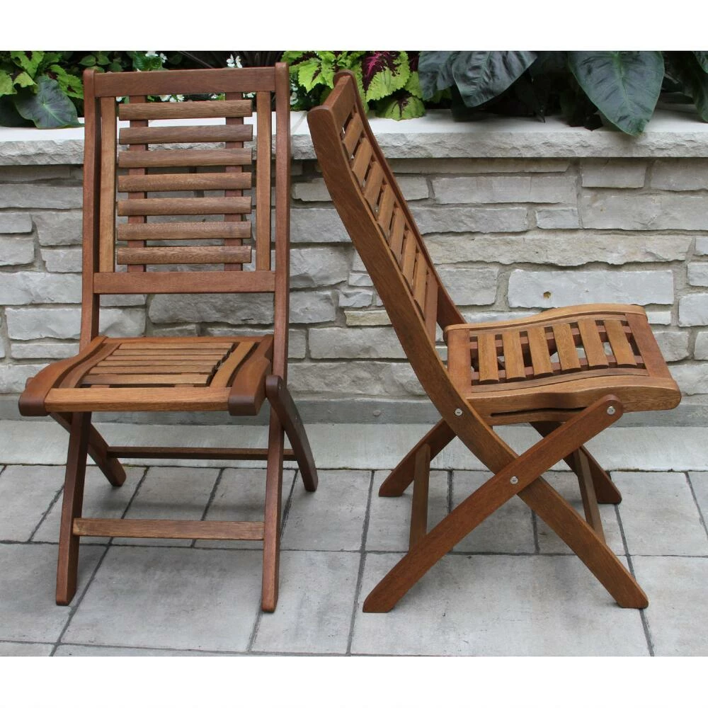 Our outdoor bistro set features a round folding table and two folding chairs with solid eucalyptus wood construction, an umber-brown stain and curved details. This handsome, compact furniture set is the perfect small-space dining solution for the patio or balcony and all three pieces fold flat for easy storage during inclement weather.
