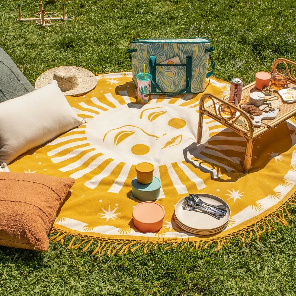 Screen printed by hand on stonewashed 100% cotton, our boho-chic picnic blanket features our exclusive design of a glorious ivory sun glowing with contentment from a golden yellow ground. Lightweight for easy transport to outdoor concerts, festivals, parks and beaches, rolling it out creates a sumptuously soft hangout spot for family and friends. Finished with sun ray-like tassels, this beautiful blanket shines brightly anywhere you take it.