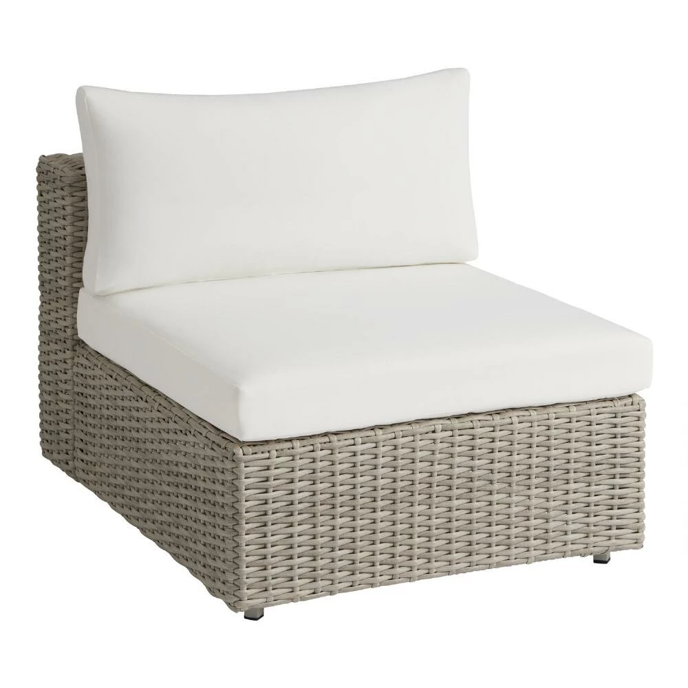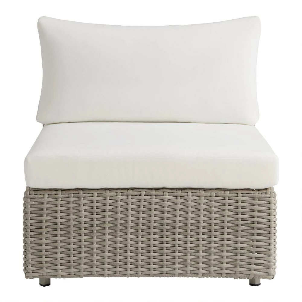 With dozens of possible configurations, our Santiago modular sectional collection creates a modern outdoor seating arrangement suited to your space. Woven of graywashed all-weather resin wicker with a chic chunky texture, this armless chair is topped with plush antique-white cushions. Perfect on its own, by pairing it with our Santiago corner-end chairs and ottoman you can build a sofa or sectional in a snap.