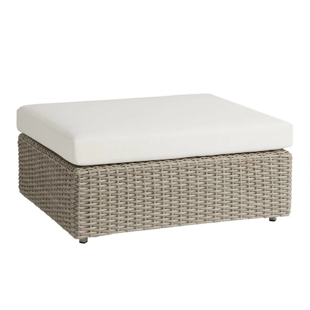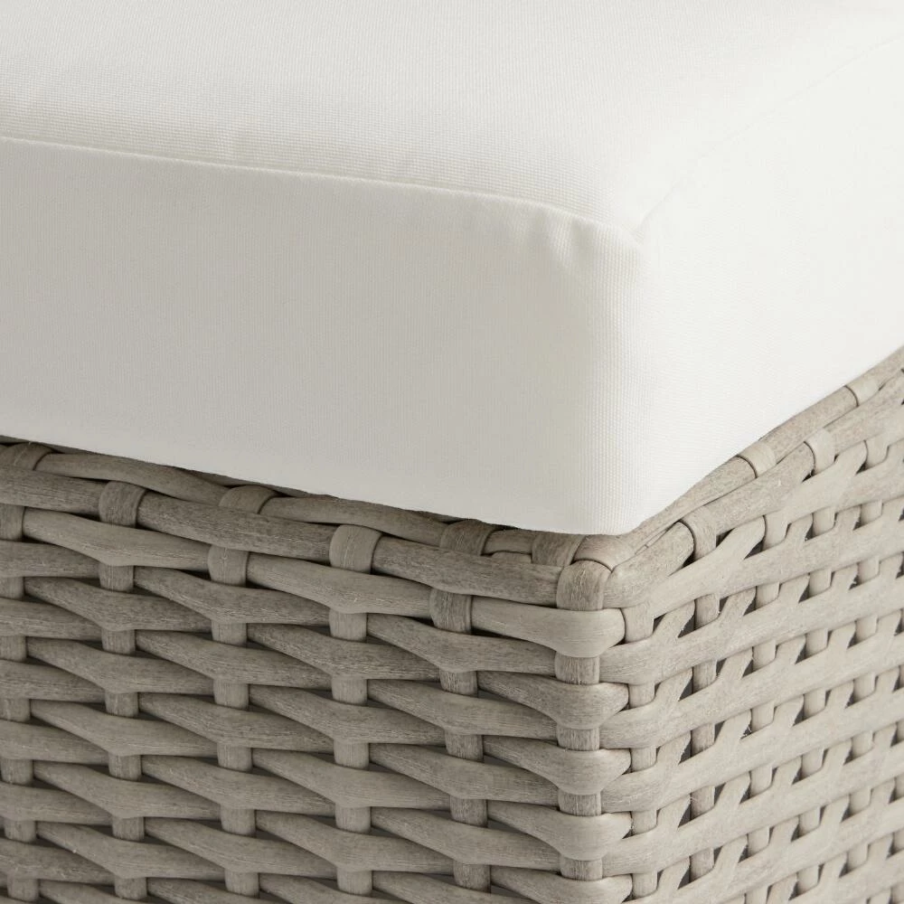 With dozens of possible configurations, our Santiago modular sectional collection creates a modern outdoor seating arrangement suited to your space. Woven of graywashed all-weather resin wicker with a chic chunky texture, this ottoman comes complete with a plush antique-white cushion. A standalone extra seat and footstool, you can pair it with our Santiago armless chairs and corner-end chairs to create the chaise for your sectional sofa.
