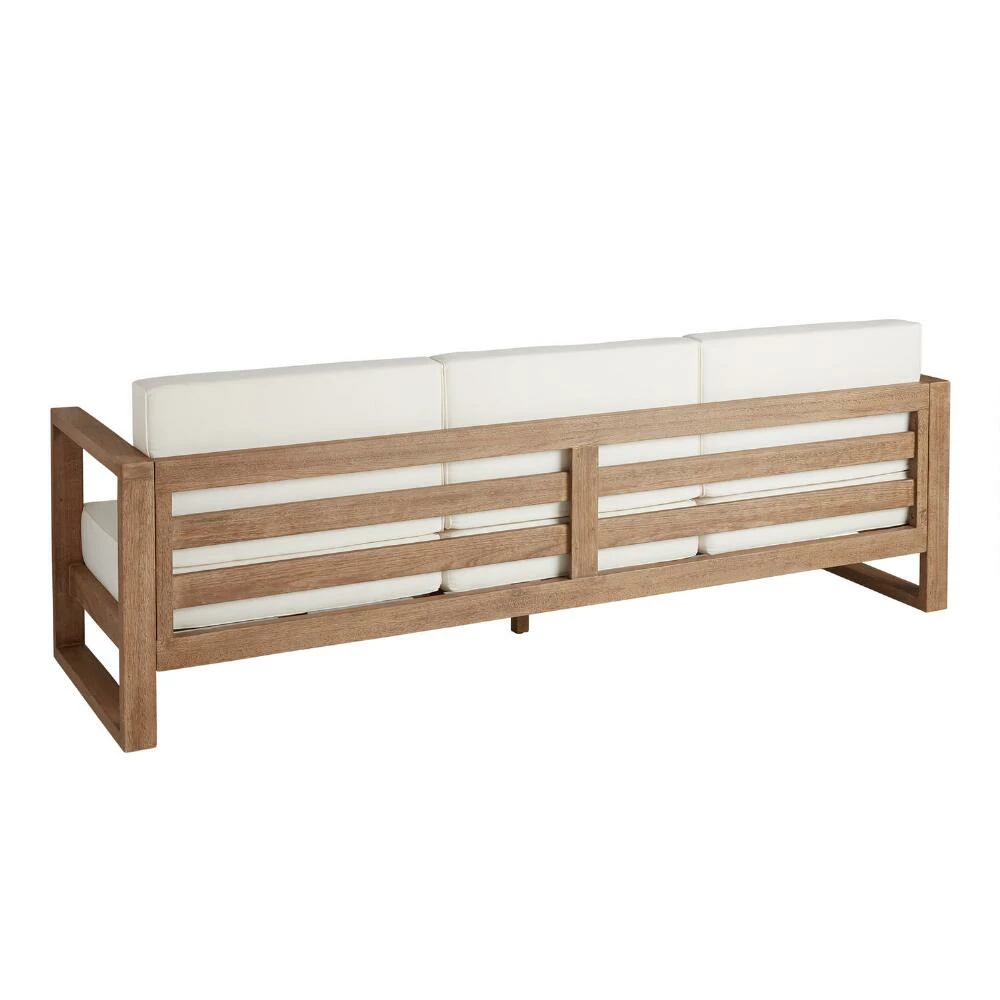 Create space for tranquil relaxation in your own backyard with our large Segovia outdoor sofa. With its impressive slatted-wood craftsmanship, hand-applied teak-inspired finish and plush ivory cushions, this substantial sofa has style to spare. This modern couch will provide the perfect patio perch for connecting with family and friends or simply curling up with a book in the fresh air.