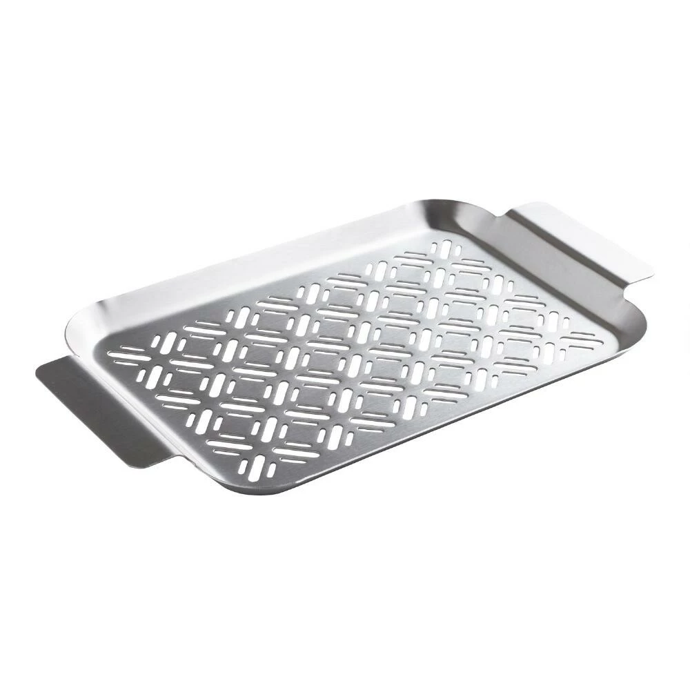 Our small stainless steel grilling grid is perfect for stir-frying or cooking flaky fish on the barbecue without pieces falling through the grill slats. This rectangular topper features diamond-shaped cutouts and raised sides, with two handles for grill-to-table serving.