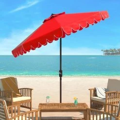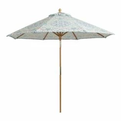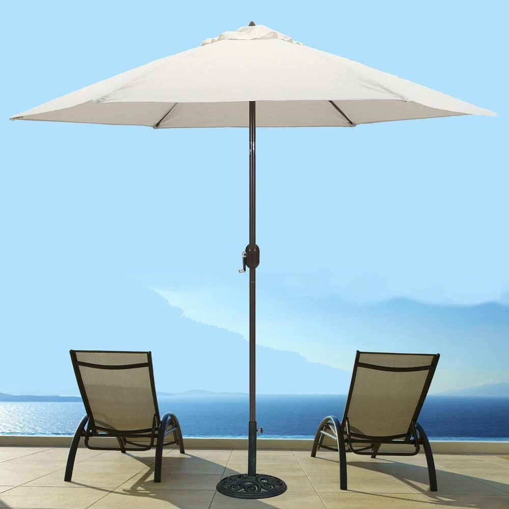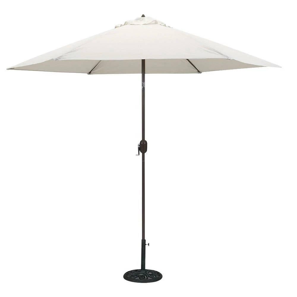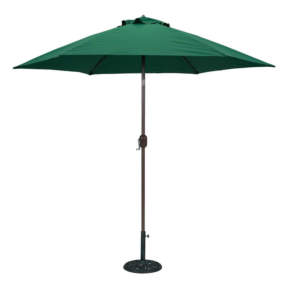 This complete 9-foot tilting umbrella canopy, frame and pole set adds relaxing shade and a fresh pop of color to your garden, deck or yard. It features a rust-resistant brown pole with three tilt positions, strong fiberglass ribs, durable steel cables and a weather-resistant canopy available in a selection of chic solid hues. Opening and closing with a crank mechanism, this reliable patio umbrella is easy to keep clean.