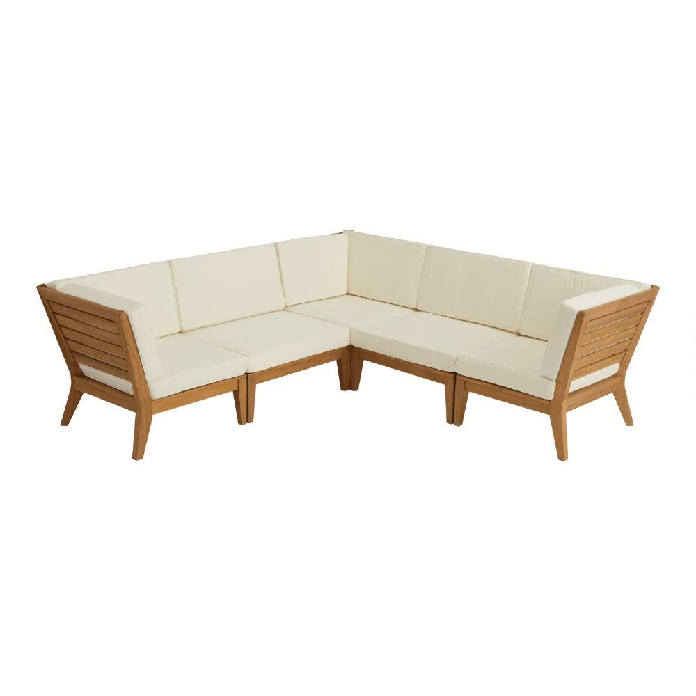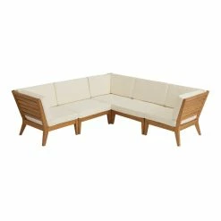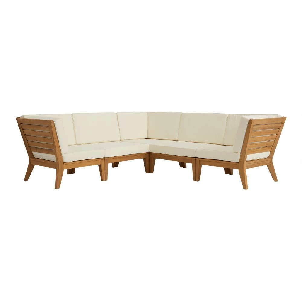 Create a comfy patio, deck or backyard seating arrangement with the Somers five-piece outdoor sectional sofa. This pre-arranged square-shaped modular sofa is made of solid teak wood with plush, durable antique white cushions for a clean-lined Scandinavian aesthetic. Designed for connection-free placement, this set includes two armless chairs and three corner chairs that create a modern sectional sized for alfresco gatherings with friends and fami