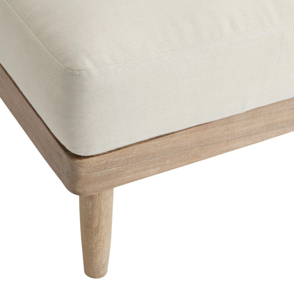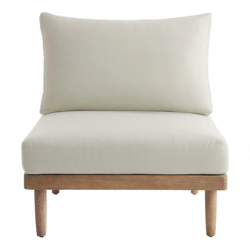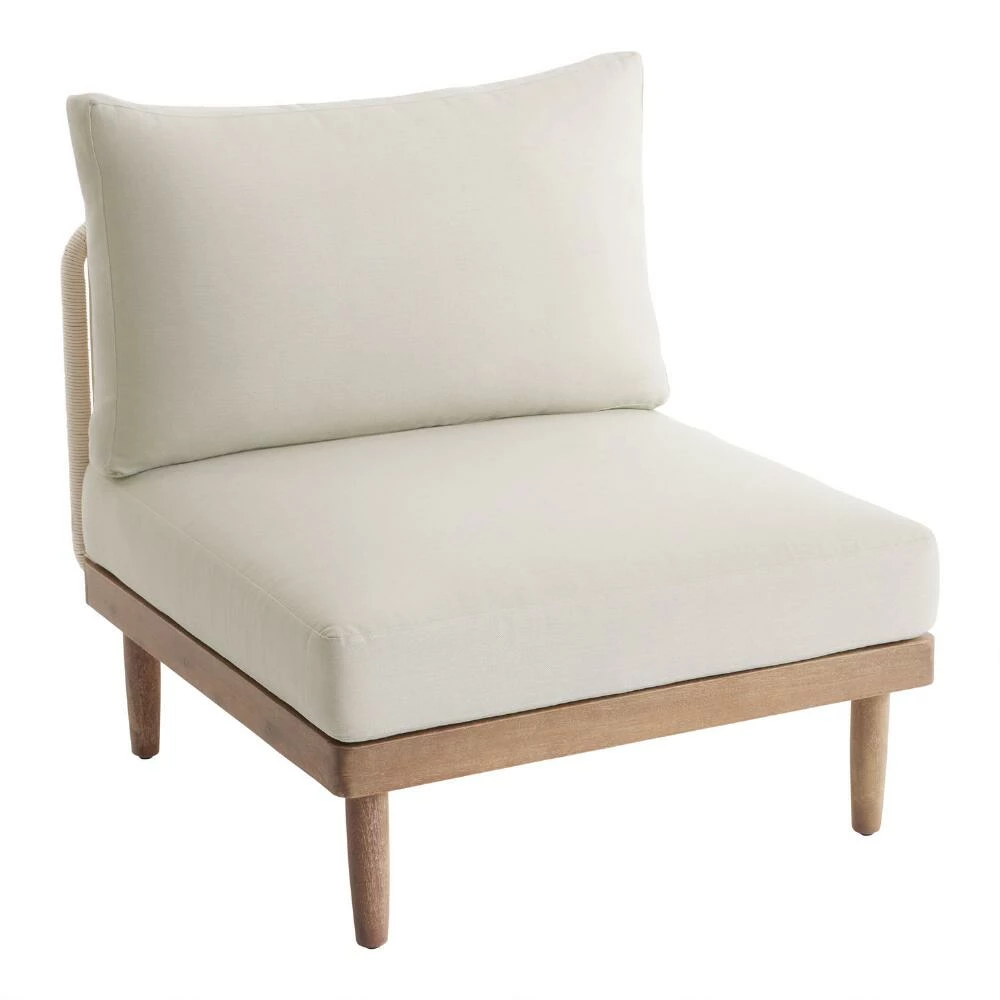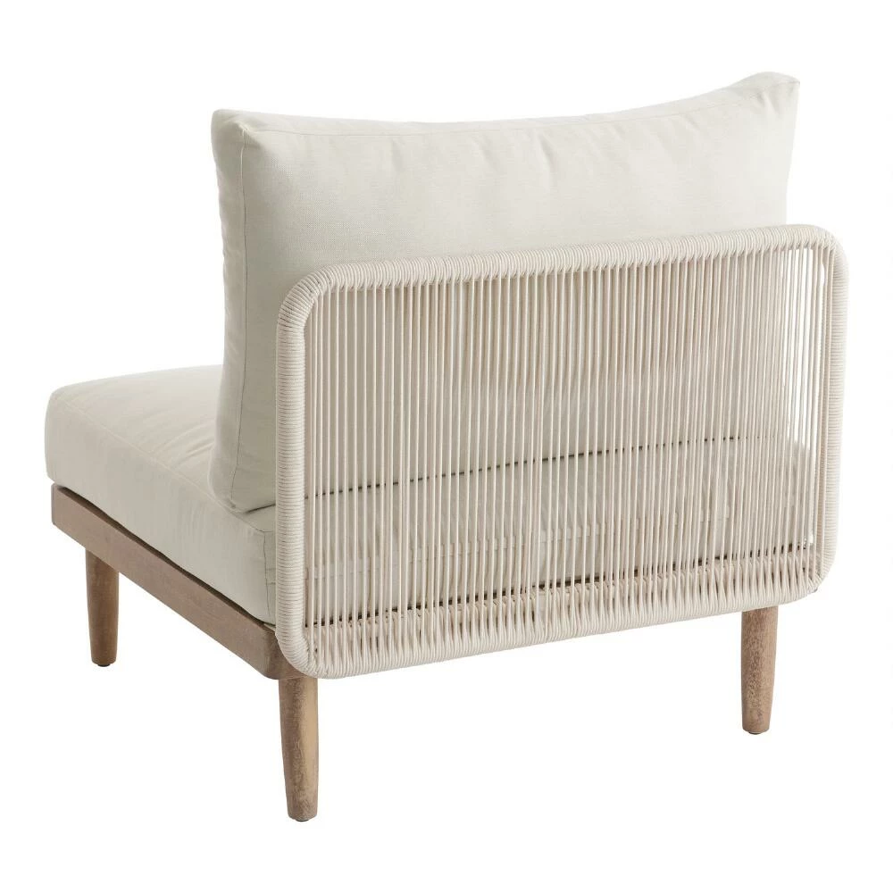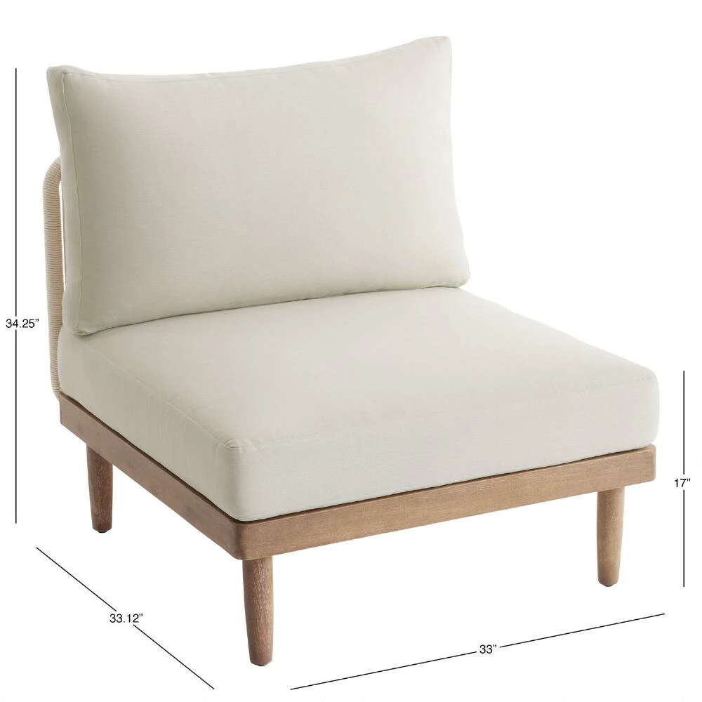 Clean-lined and casual with a modern nautical vibe, this weather-ready outdoor armless chair is a customizable component of our Sorano modular sectional collection. This acacia wood patio seat invites you to unwind with its expertly rigged natural sailing-rope backrest and plush cushions in posh antique white. A seaworthy chair on its own, you can arrange it with other Sorano pieces to create the ideal backyard seating arrangement.