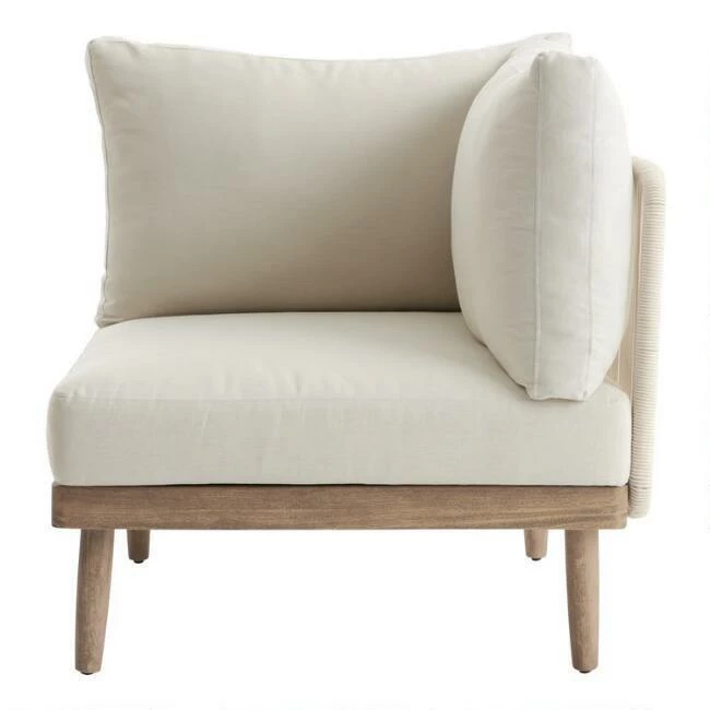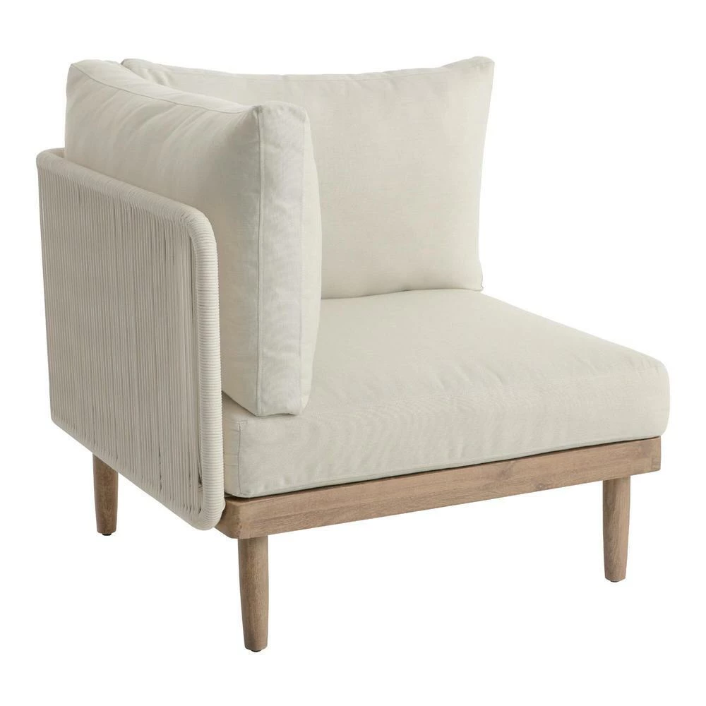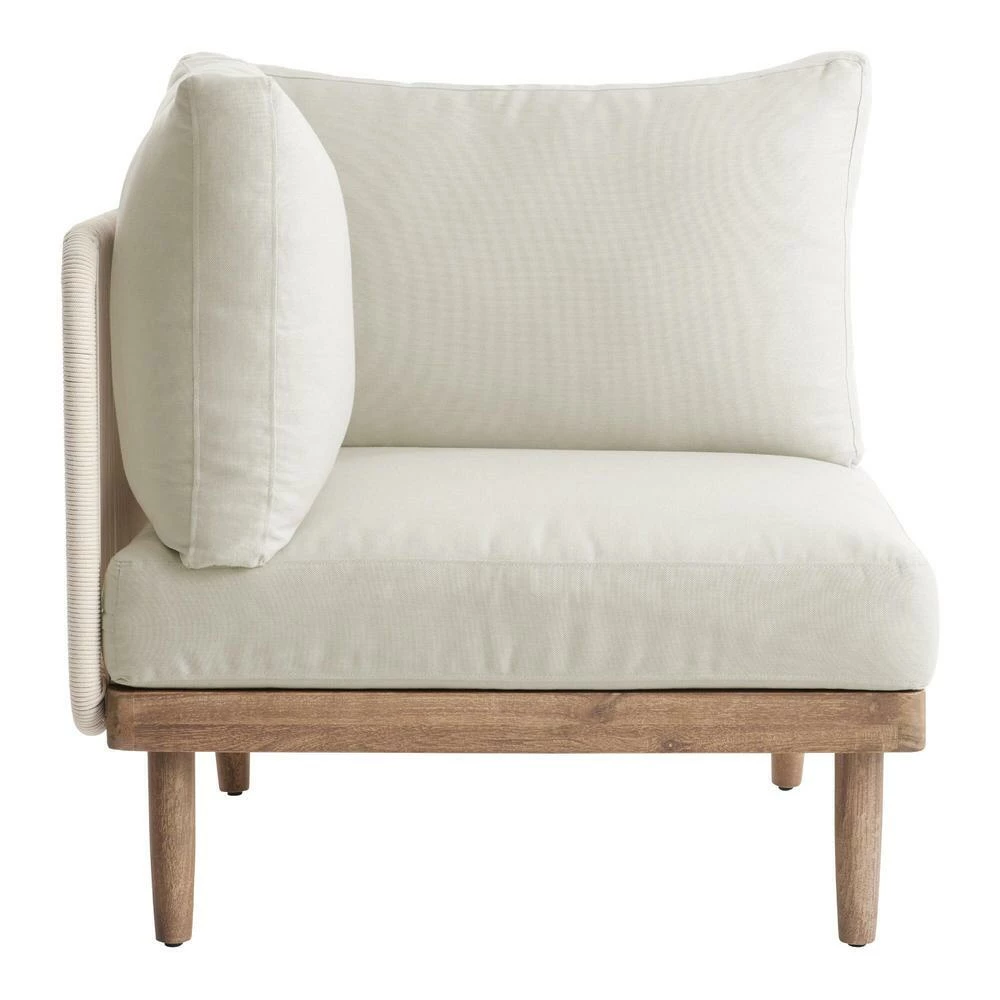 Clean-lined and casual with a modern nautical vibe, this weather-ready outdoor corner chair is a customizable component of our Sorano modular sectional collection. This acacia wood patio seat invites you to unwind with its expertly rigged natural sailing-rope backrest and plush cushions in posh antique white. A seaworthy chair on its own, you can arrange it with other Sorano pieces to create the ideal backyard seating arrangement.