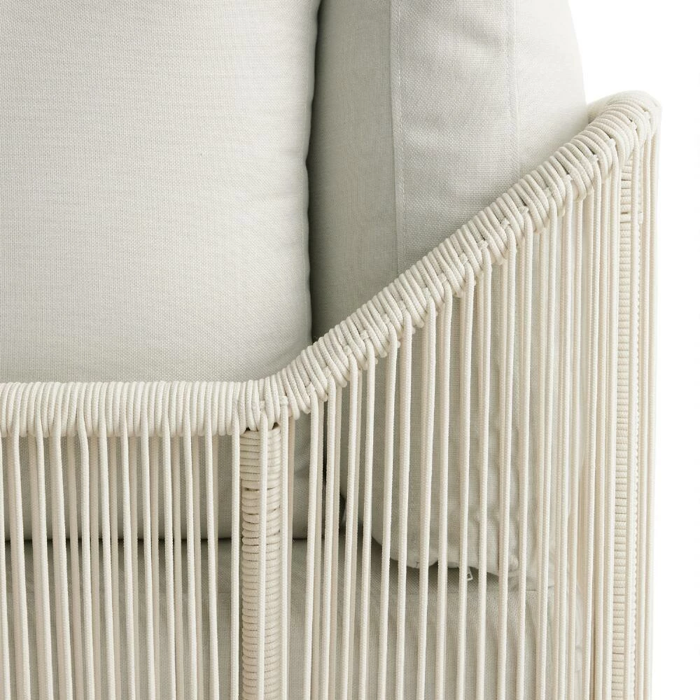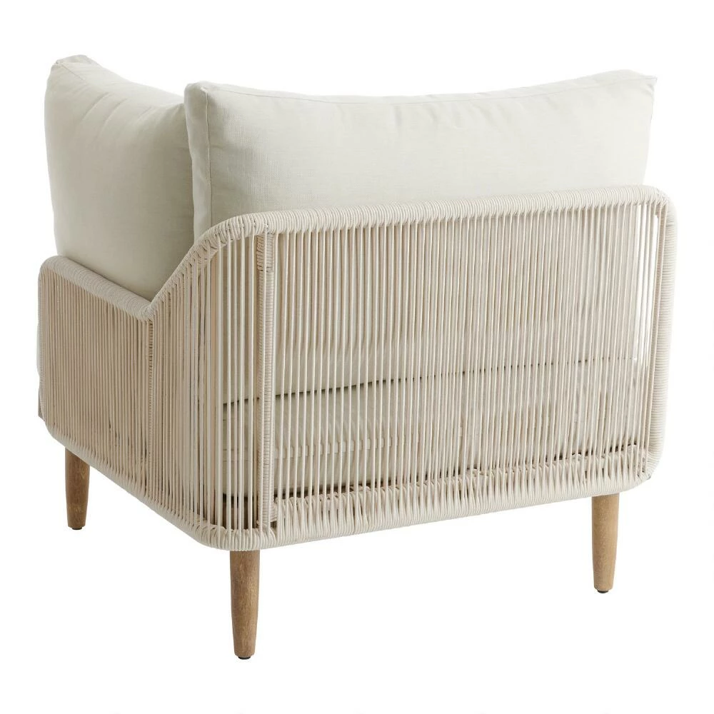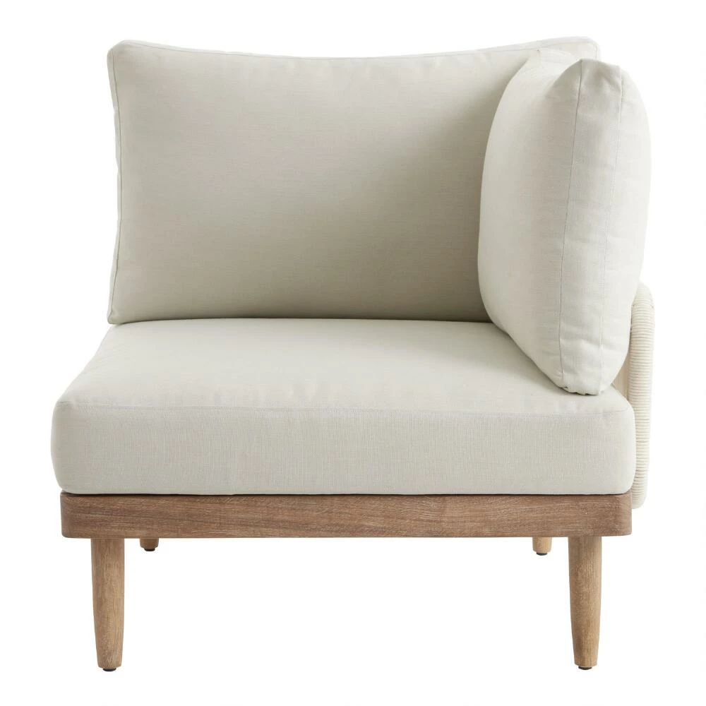 Clean-lined and casual with a modern nautical vibe, this right-facing outdoor armchair is a customizable component of our Sorano modular sectional collection. Weather-ready with plush cushions in posh antique white, this acacia wood patio seat features an expertly rigged natural sailing-rope backrest and chic sloping arm. Arrange this seaworthy chair with other Sorano pieces to create the ideal backyard seating arrangement.