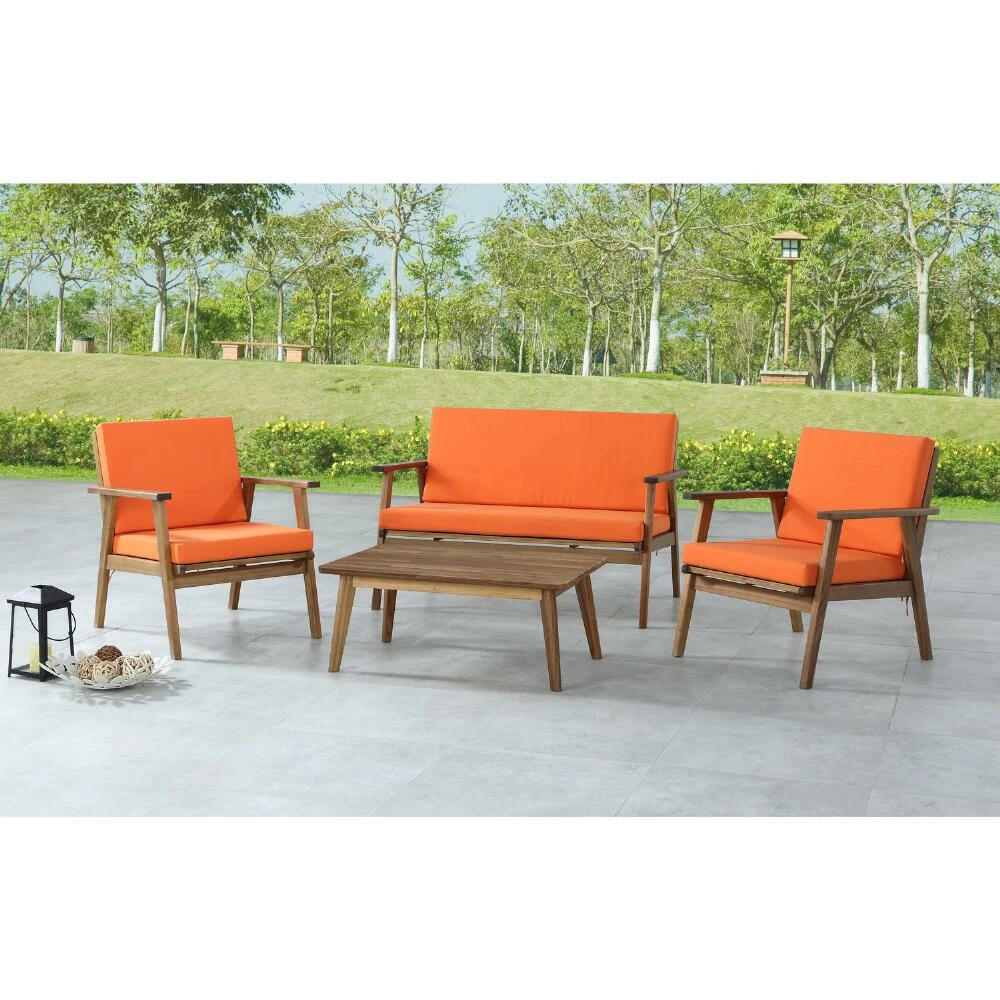 Create a backyard oasis with this cozy patio furniture set featuring acacia wood frames and comfy cushions made of performance fabric that resists wear. This mid-century-modern occasional set includes two roomy chairs, a compact loveseat and matching coffee table with a traditional acorn-brown stain. Available with an array of chic hued cushions, it creates instant luxury in your backyard that invites guests to sit and stay a while.