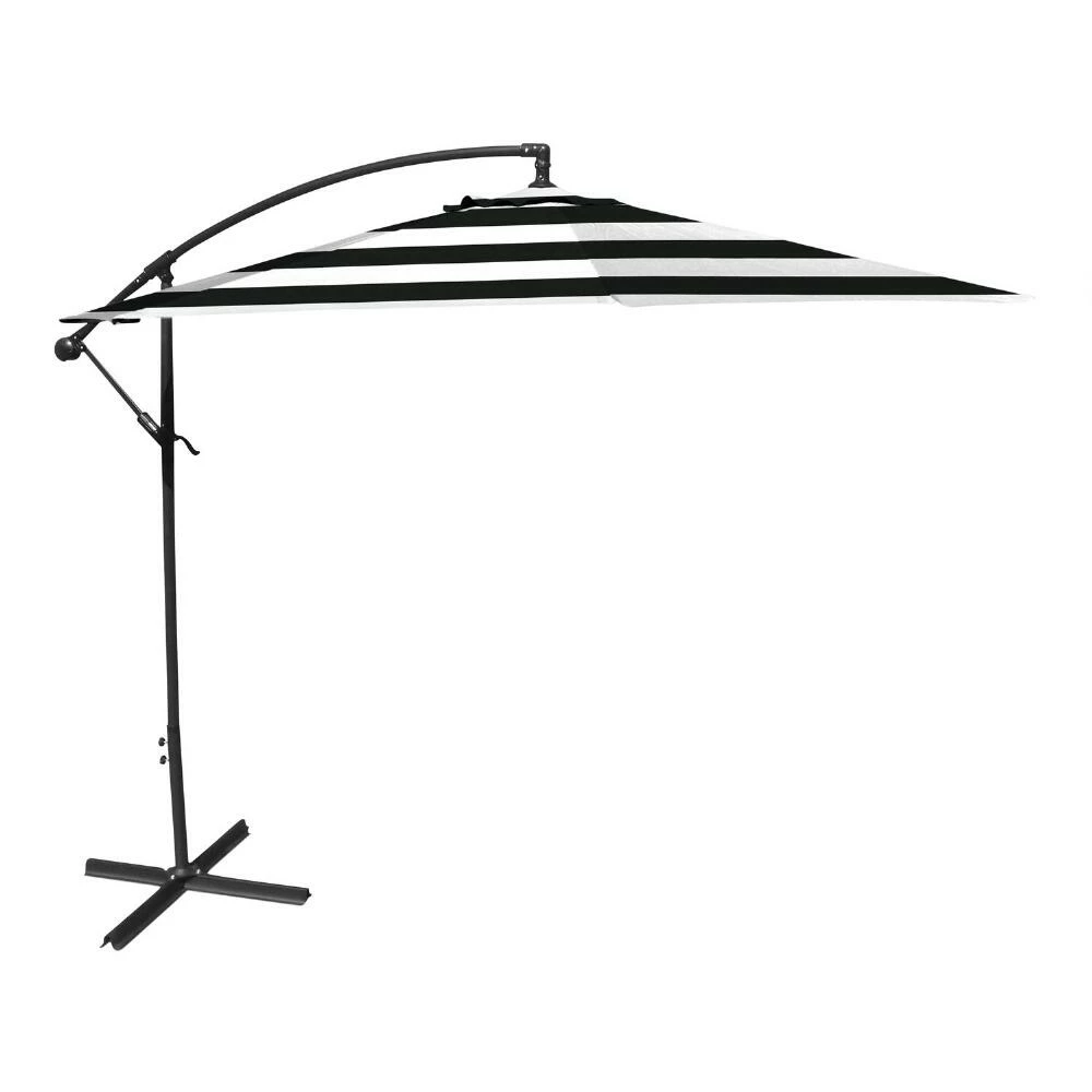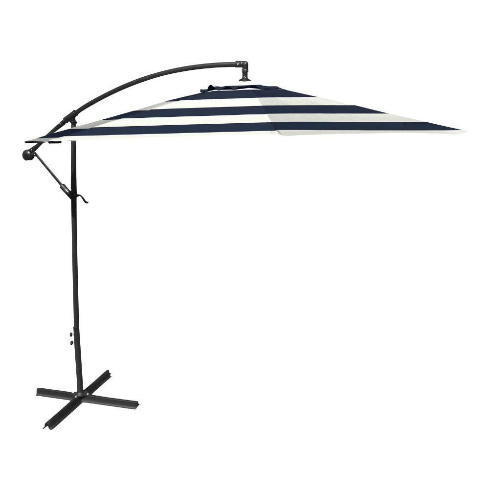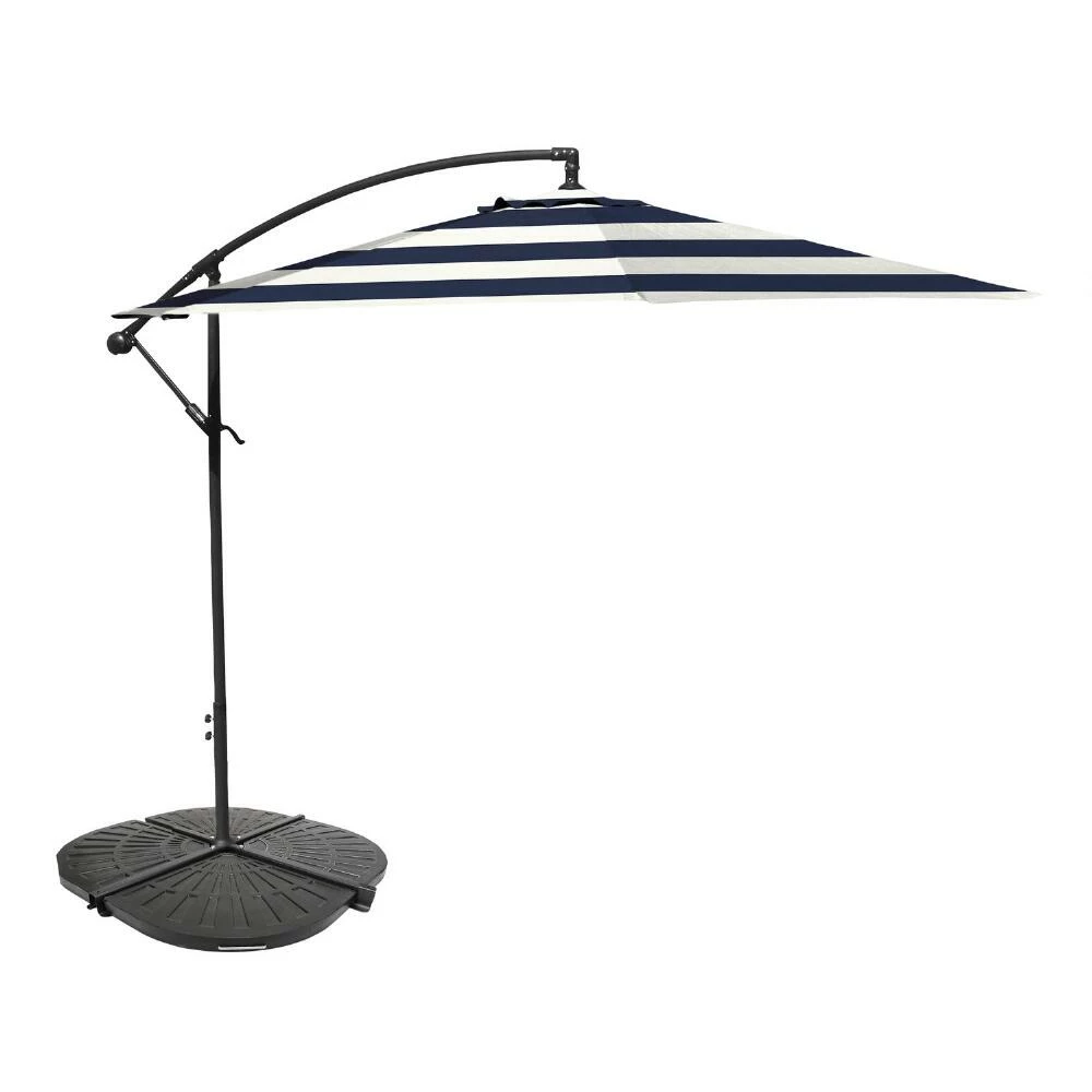 With a convenient crank and tilt option, this 10-foot cantilever patio umbrella shelters your outdoor space with a wide span of shade. Made of heavyweight fabric that resists harsh U.V. rays and weather, its octagonal canopy features classic two-tone stripes in white and your choice of colors. Pair this stylish modern tilting umbrella with two to four of our coordinating cantilever weight bases to anchor it safely in your outdoor oasis.