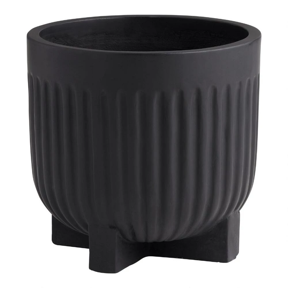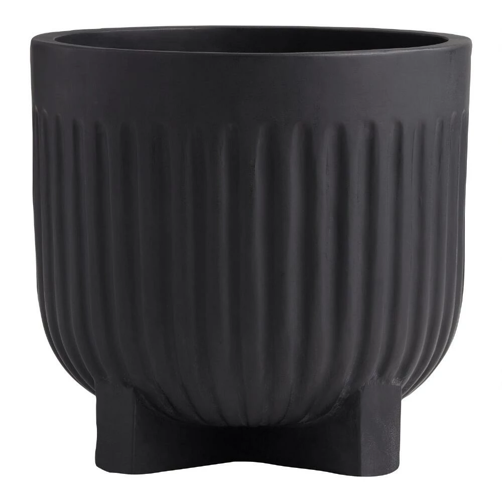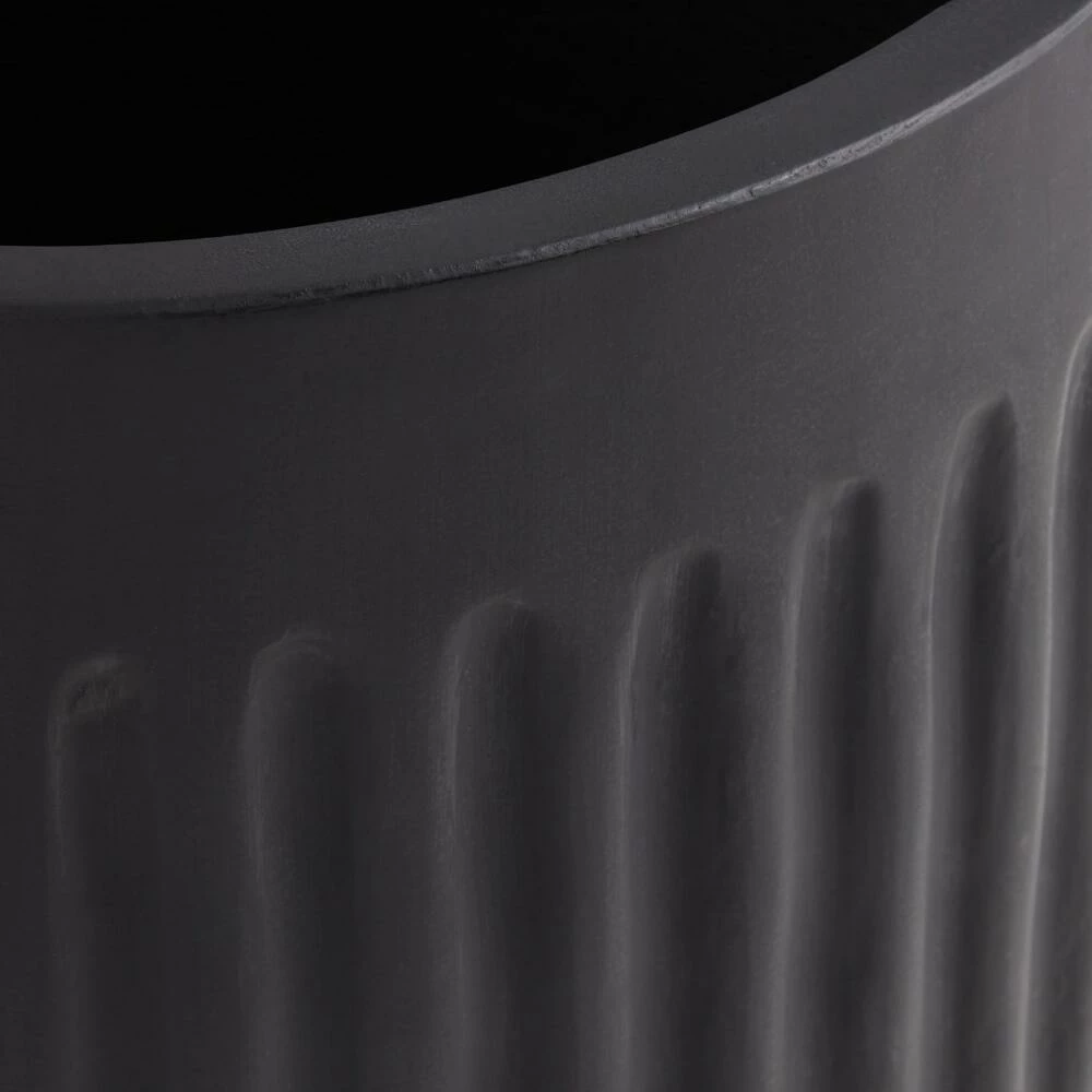 Handcrafted of weather-resistant black cement, the large Taylor outdoor planter features sophisticated fluted sides and a unique X-crossed footed base. Sized to cultivate big plants or an assortment of flowers and herbs, the raised geometric base allows for proper drainage. A chic vessel with its textured vertical fluting and dramatic black hue, this ultra-durable planter pot will be a mainstay of your patio or deck decor for years to come.