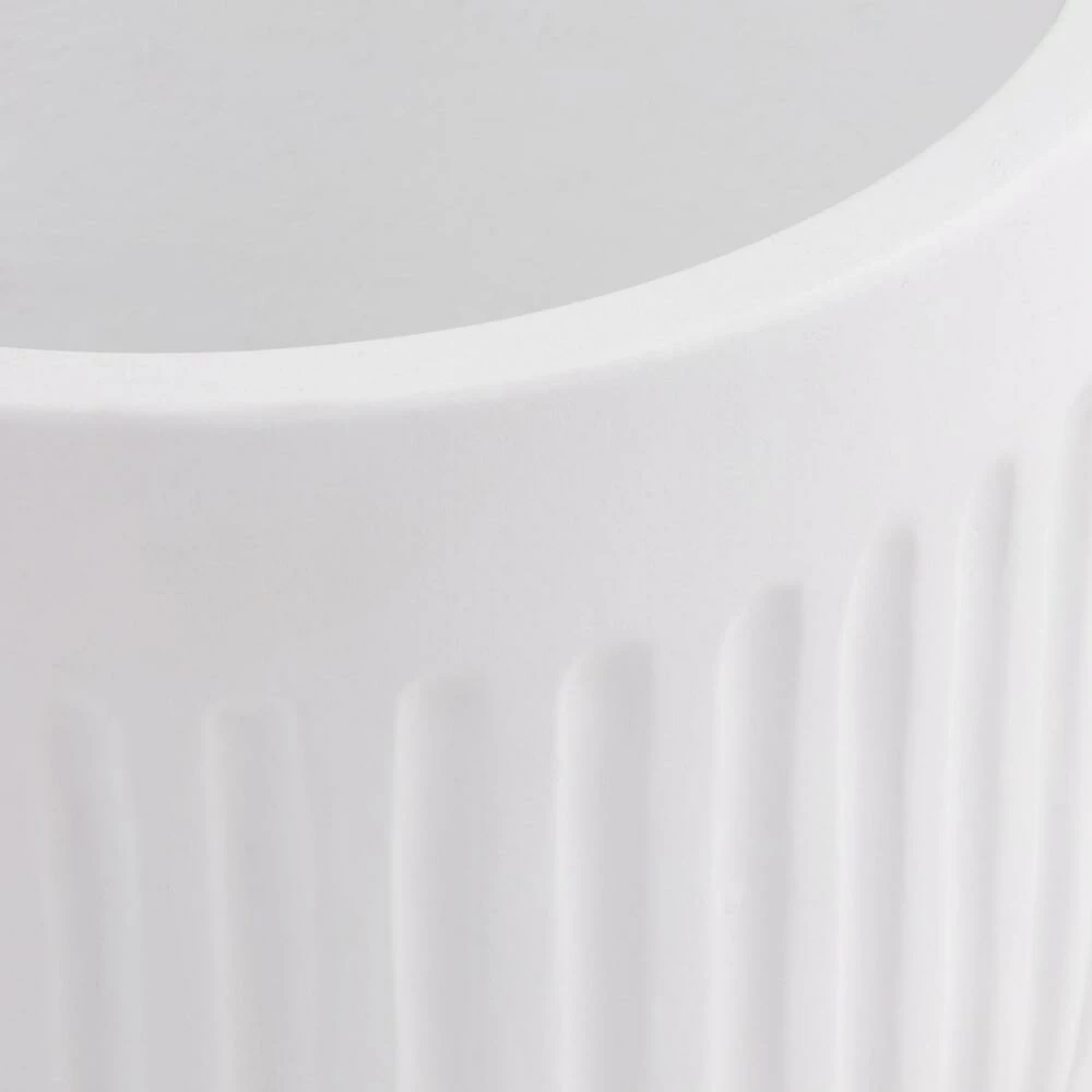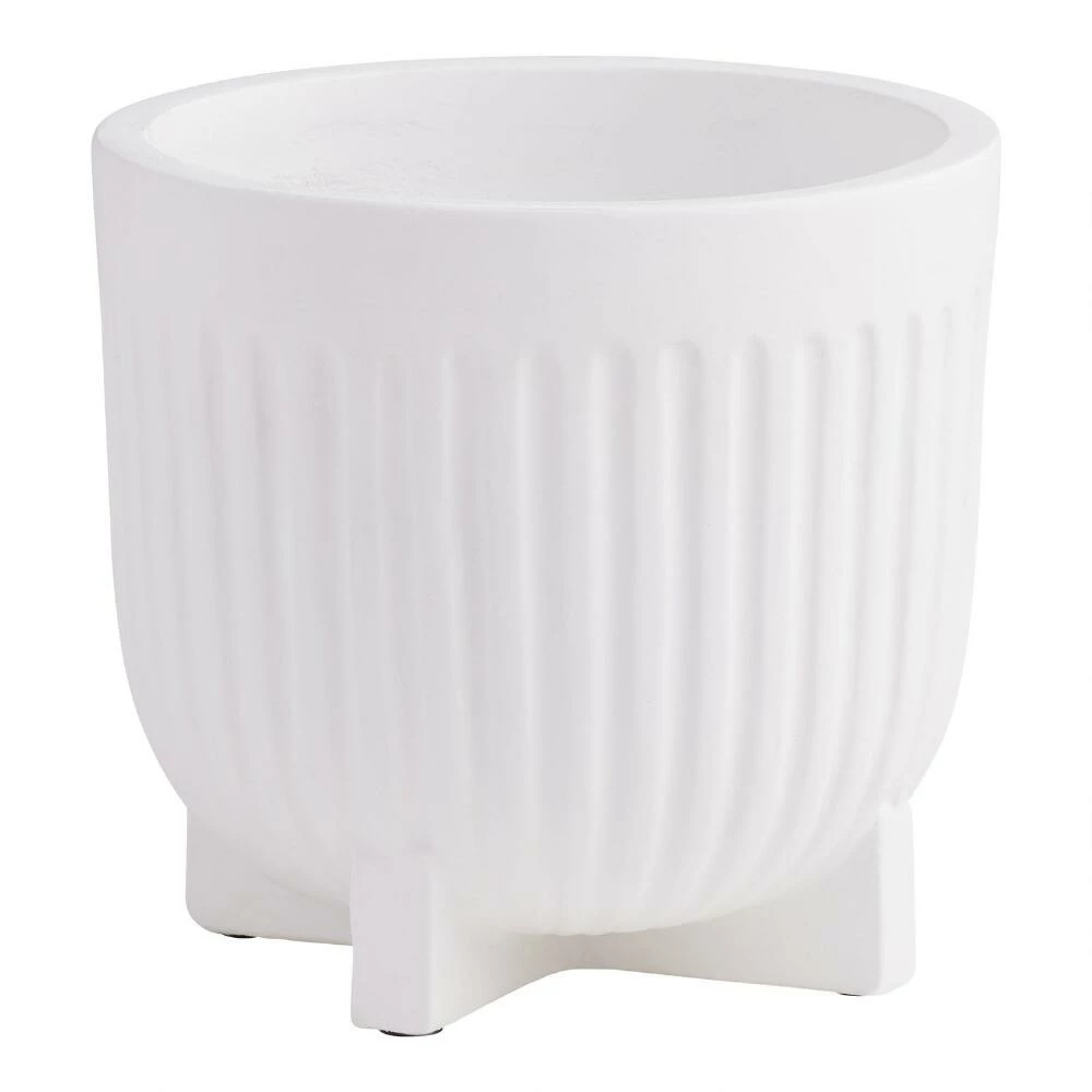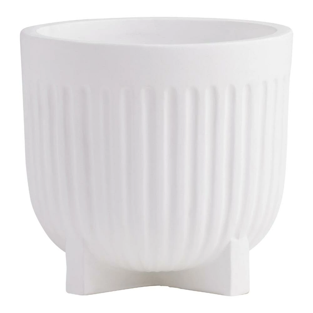 Handcrafted of weather-resistant white cement, the round Taylor outdoor planter features elegant fluted sides and a unique X-crossed footed base. A sophisticated vessel for your favorite flowers and greenery with its textured vertical fluting and bright white hue, the raised geometric base allows for proper drainage. This ultra-durable planter pot will be a mainstay of your patio or deck decor for years to come.
