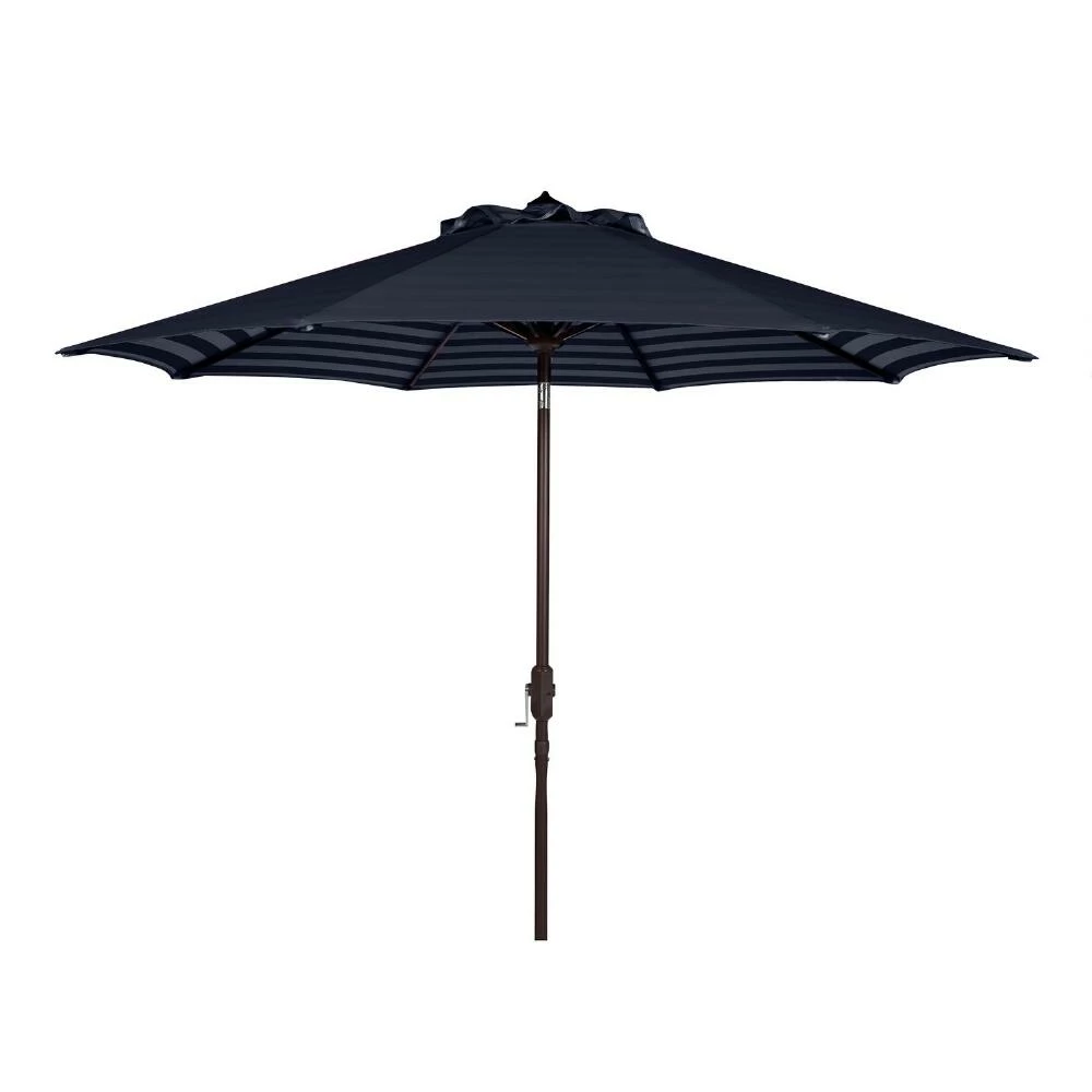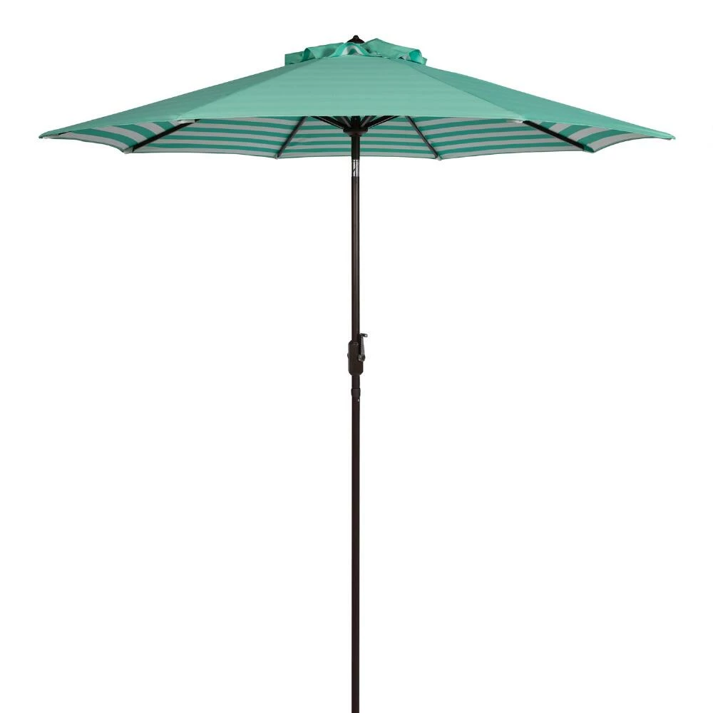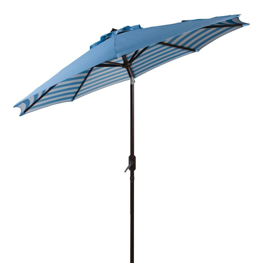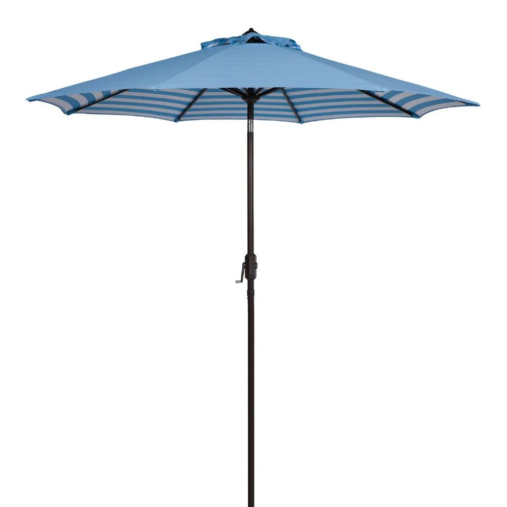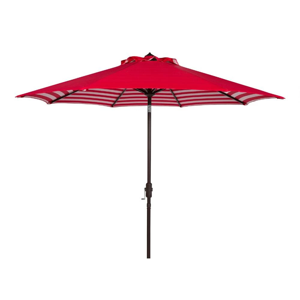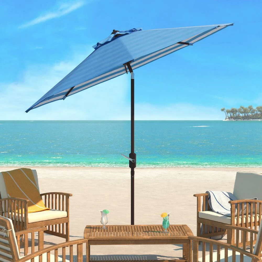 Inspired by the decor of Monaco’s finest resorts, this 9-foot tilting patio umbrella features a canopy with white stripes underneath its solid-hued top. Shielding your outdoor setup from harsh U.V. rays., the weather-resistant canopy is available in your choice of colors. The brown crank-lift umbrella frame tilts to a 45-degree angle with the push of a button, providing adjustable sun protection to you backyard or deck at any time of day.