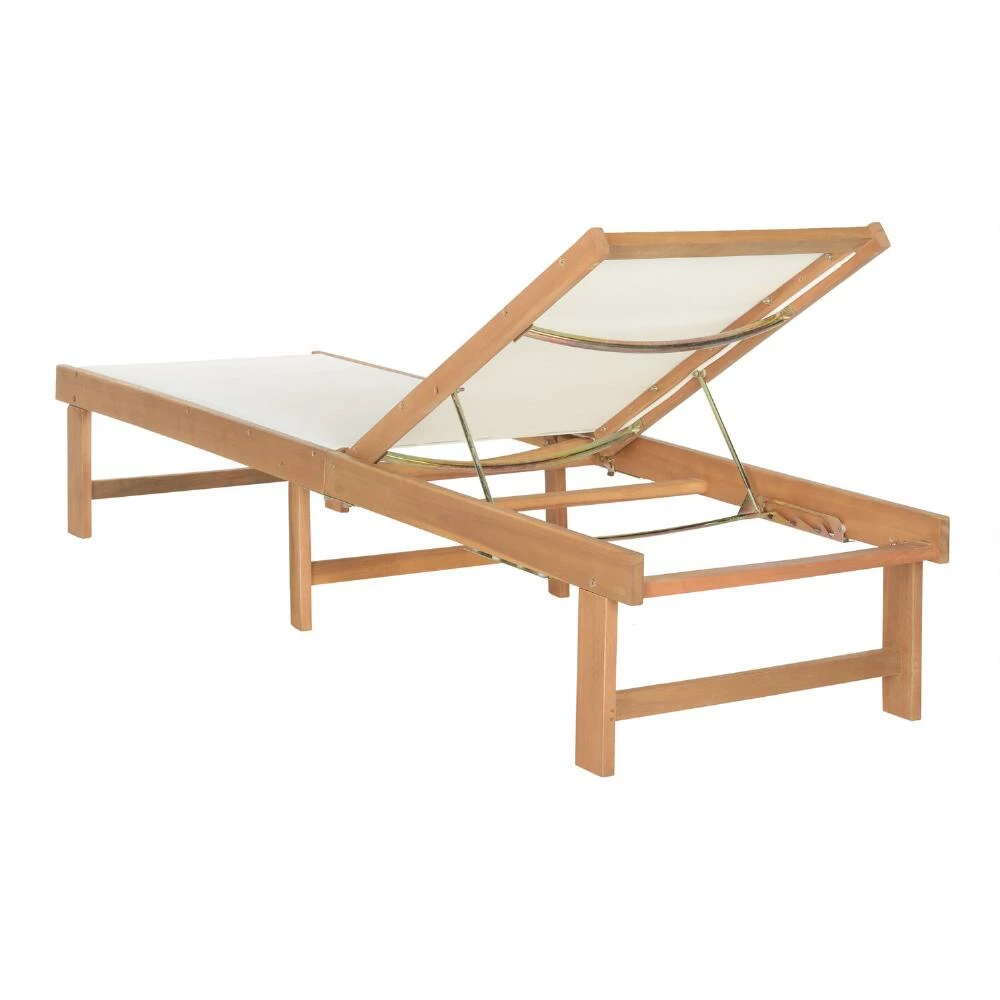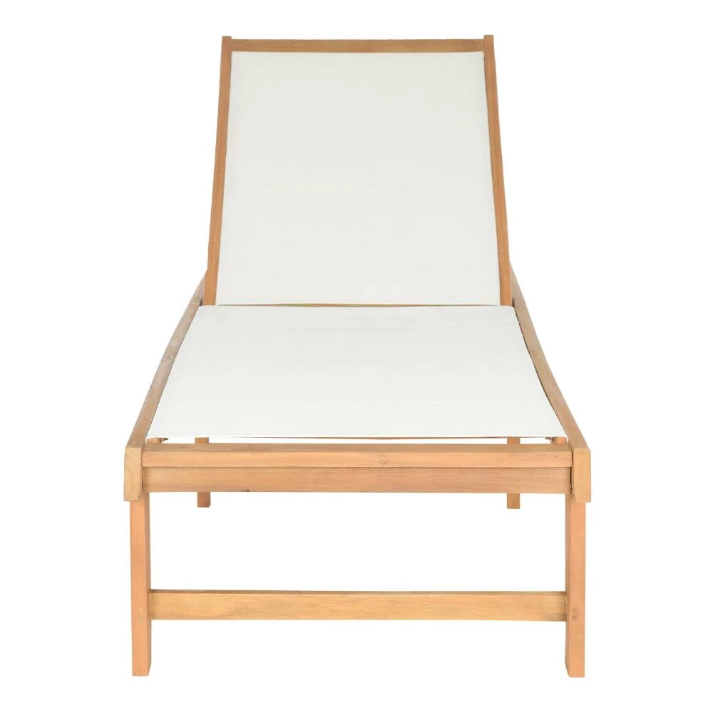 The Virden outdoor chaise lounge features an acacia wood frame with a seat and backrest woven with long-lasting all-weather Textilene fabric in a neutral beige hue. This two-tone patio lounge chair is easily adjustable with four recline positions for reading, sunbathing and relaxing. A streamlined pool lounger that blends with any decor, it combines a durable construction with an incredibly comfortable feel.